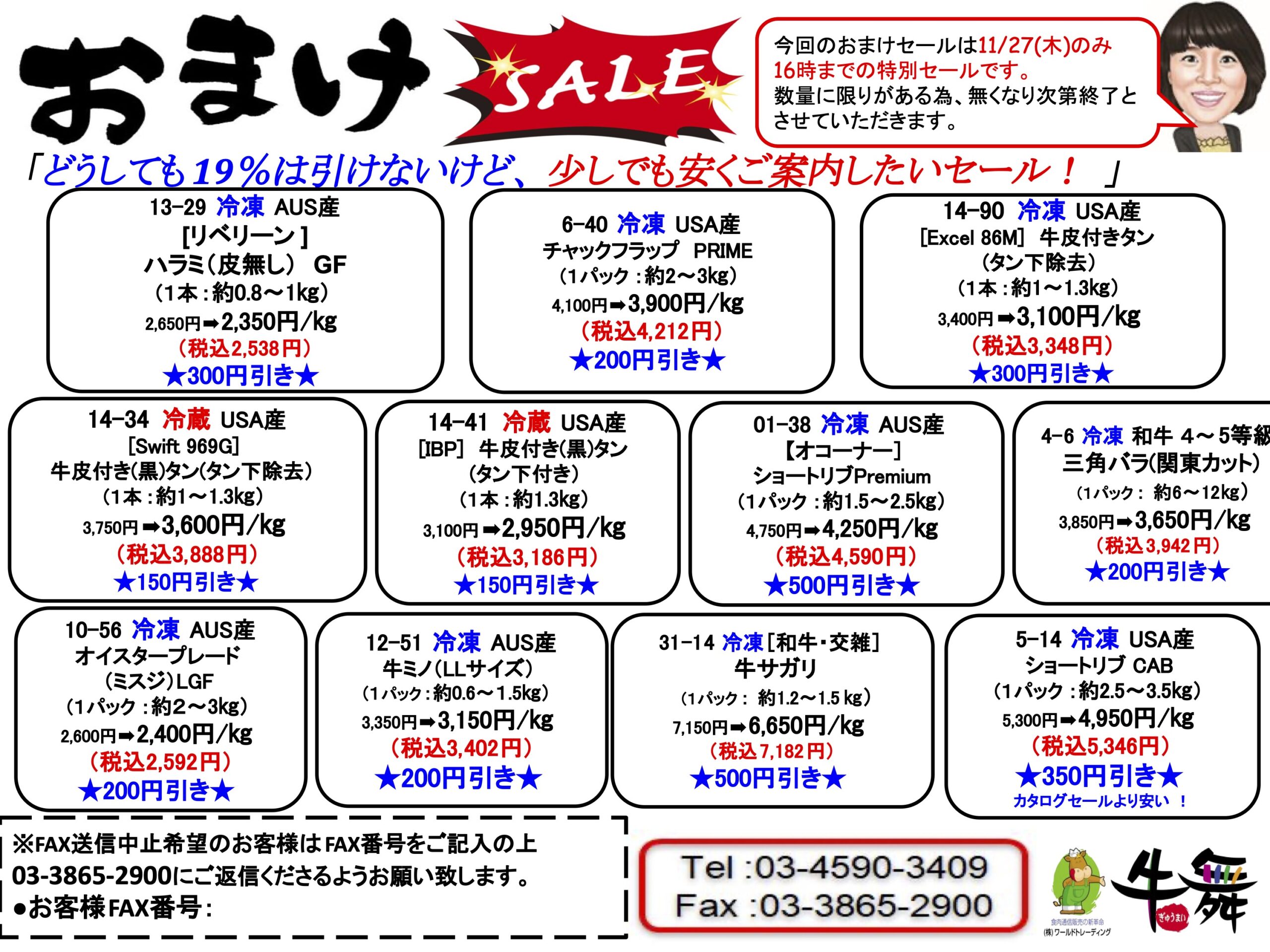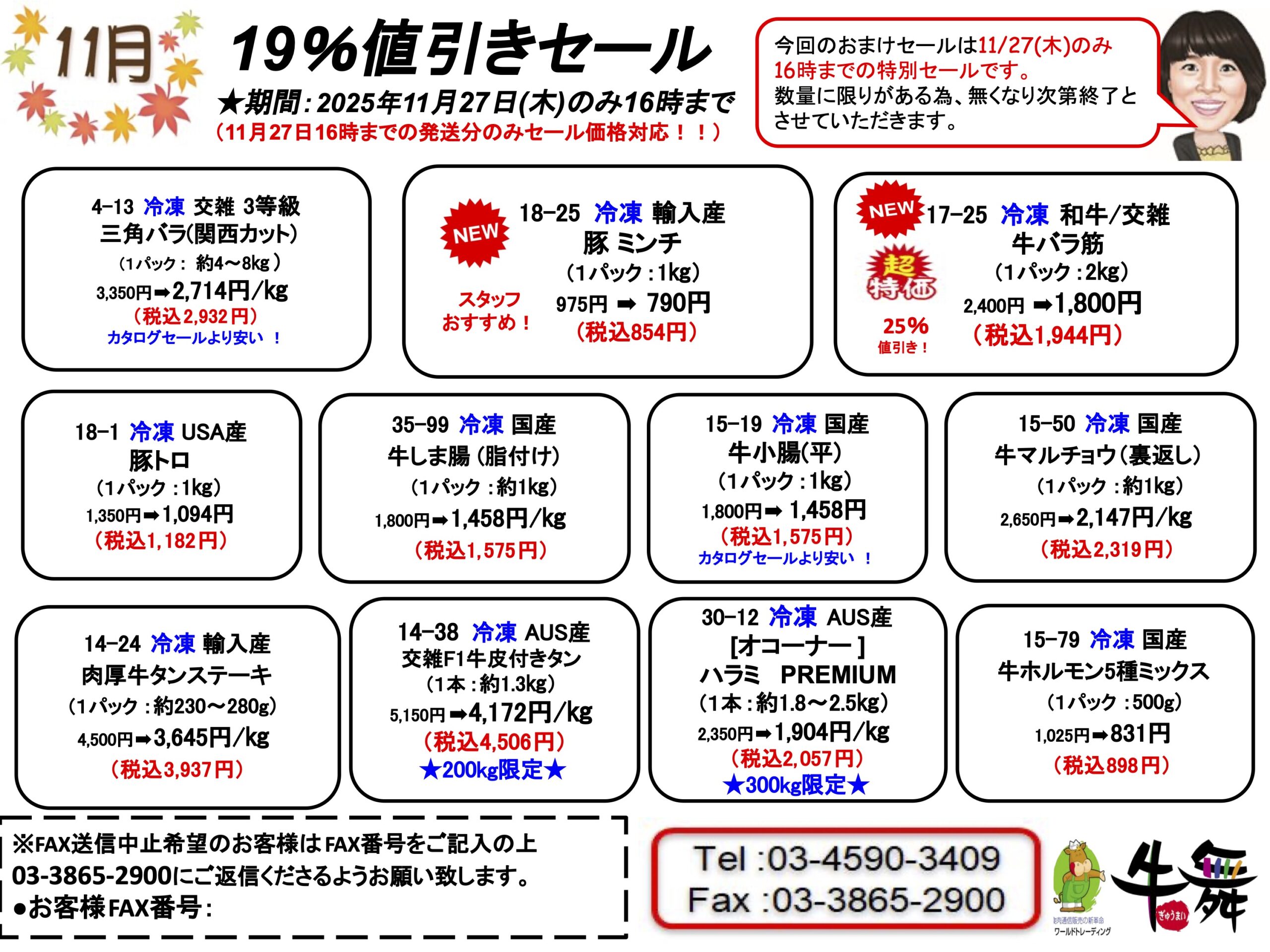 2025年11月27(木) 牛舞 11月19%、おまけセール